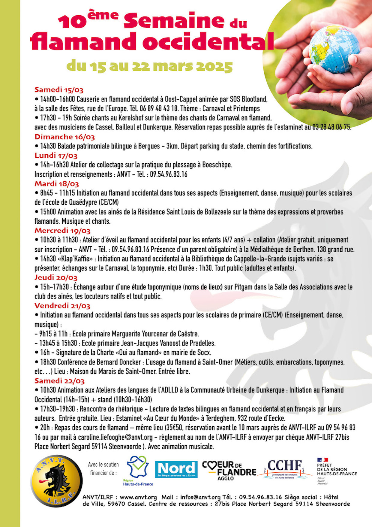 Au programme : causerie, soirée chants, balade patrimoniale, atelier de collectage, initiations au flamand occidental pour les petits, les scolaires et les adultes, atelier mémoire pour les aînés, étude toponymique, signature d'une charte de la signalétique bilingue, conférence, rencontre de rhétorique et bien sûr convivialité flamande.