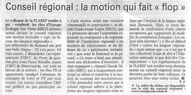 L'Indicateur des Flandres a publié le 06 janvier 2010 un article concernant l'expérimentation de l'enseignement du flamand intitulé "Le flamand doit se raccrocher aux autres langues régionales"