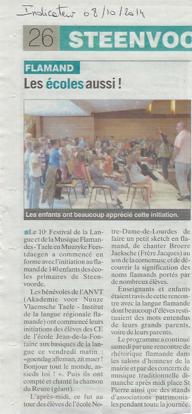 Le Journal des Flandres a publié le 17 juillet 2008 un article concernant l'enseignement scolaire du flamand intitulé "Esquelbecq - Cours de flamand pour les enfants".