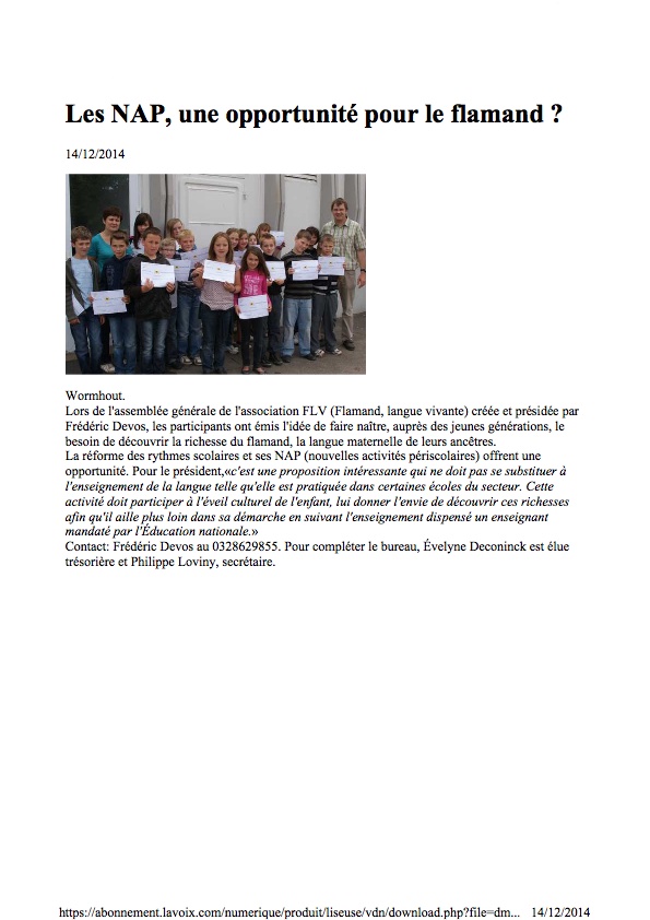 La Voix du Nord, édition de Dunkerque, a publié le 26 août 2008 un article concernant la reprise des cours de langue régionale flamande à Bergues et dans le dunkerquois intitulé "les cours de flamand reprennent".