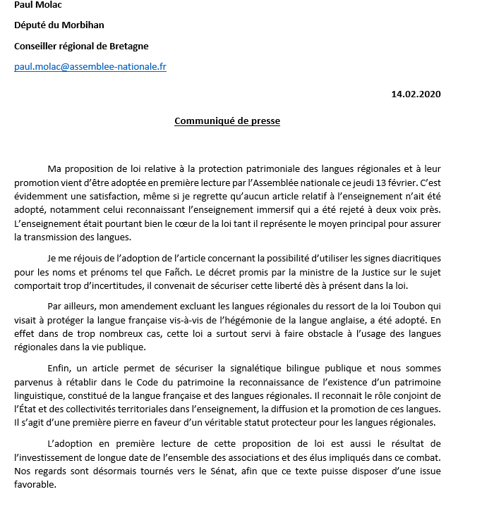 Communiqué de presse du député Molac suite au vote de sa proposition de loi 2548 sur les langues régionales