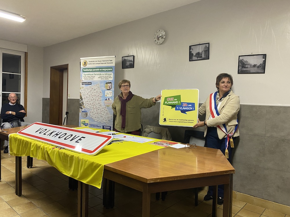 Nathalie Beun, burgemeësteresse van Volkhoove, het de 59ste Keure voor de tweëtaelige paneels handteëken deezen 10sten van Oktoober al begunnen mee de ingangpaneels van 't durp.